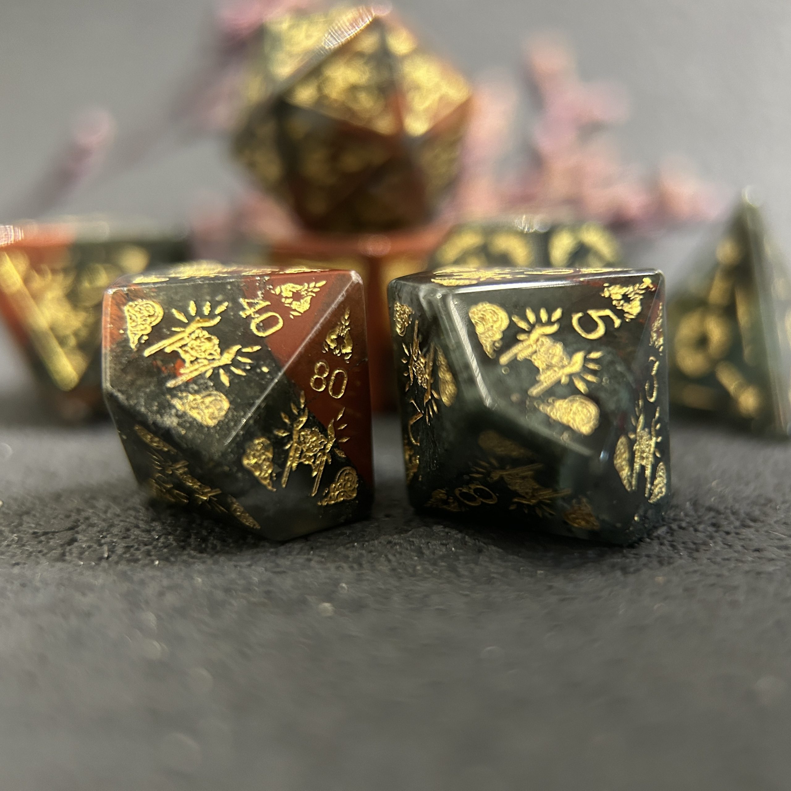 African Bloodstone gemstone Dice Set, Cloudward: Dragon’s Throne & Edge, 7 Pieces